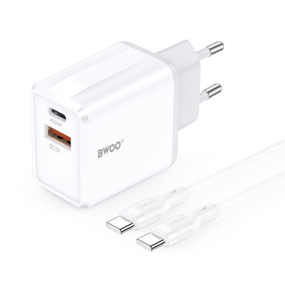 BWOO ładowarka sieciowa CDA182 QC 1x USB-A + 1x USB-C 3,8A 38W z kablem USB-C 1 m biała