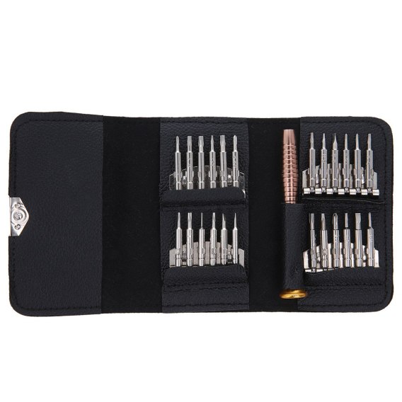 Wysokiej jakości zestaw dwudziestu pięciu narzędzi do otwierania wszelkiego rodzaju urządzen elektronicznych. Cały zestaw zapakowany jest w etui w kształcie portfela. Zestaw zawiera: Precyzyjny wkrętak serwisowy oraz 24 bity: -5 sztuk bitów krzyżakowych (philips): 1.0, 1.2, 1.5, 2.0, 3.0-4 sztuki bitów płaskich: 1.0, 1.5, 2.0, 3.0 -1 sztuka bitu punktowego 0.8-1 sztuka bitu tri-point Y 2.0-1 sztuka bitu o przekroju trójkątnym: 2.3-10 sztuk bitów torx: T2, T3, T4, T5, T6, T7, T8, T9, T10, T15-2 sztuki bitów pięcioramiennych gwiazdkowych pentalobe: 0.8, 1.2